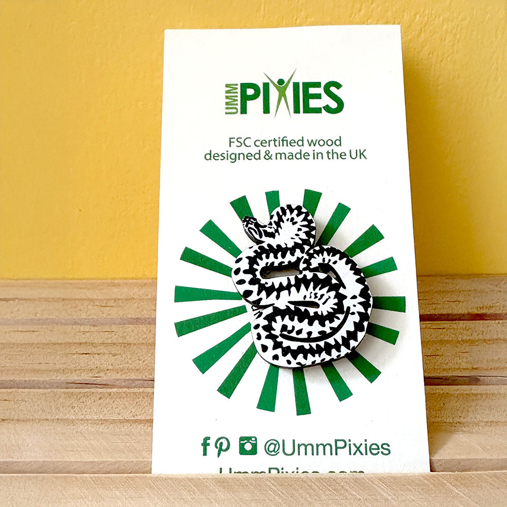 An eco-friendly wooden lapel pin badge featuring my brand new adder from my British Reptiles collection.These wooden pin badges use 20 to 24 times less energy to produce than enamel pin badges.