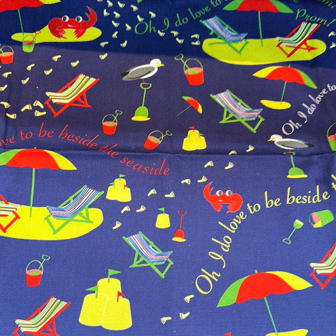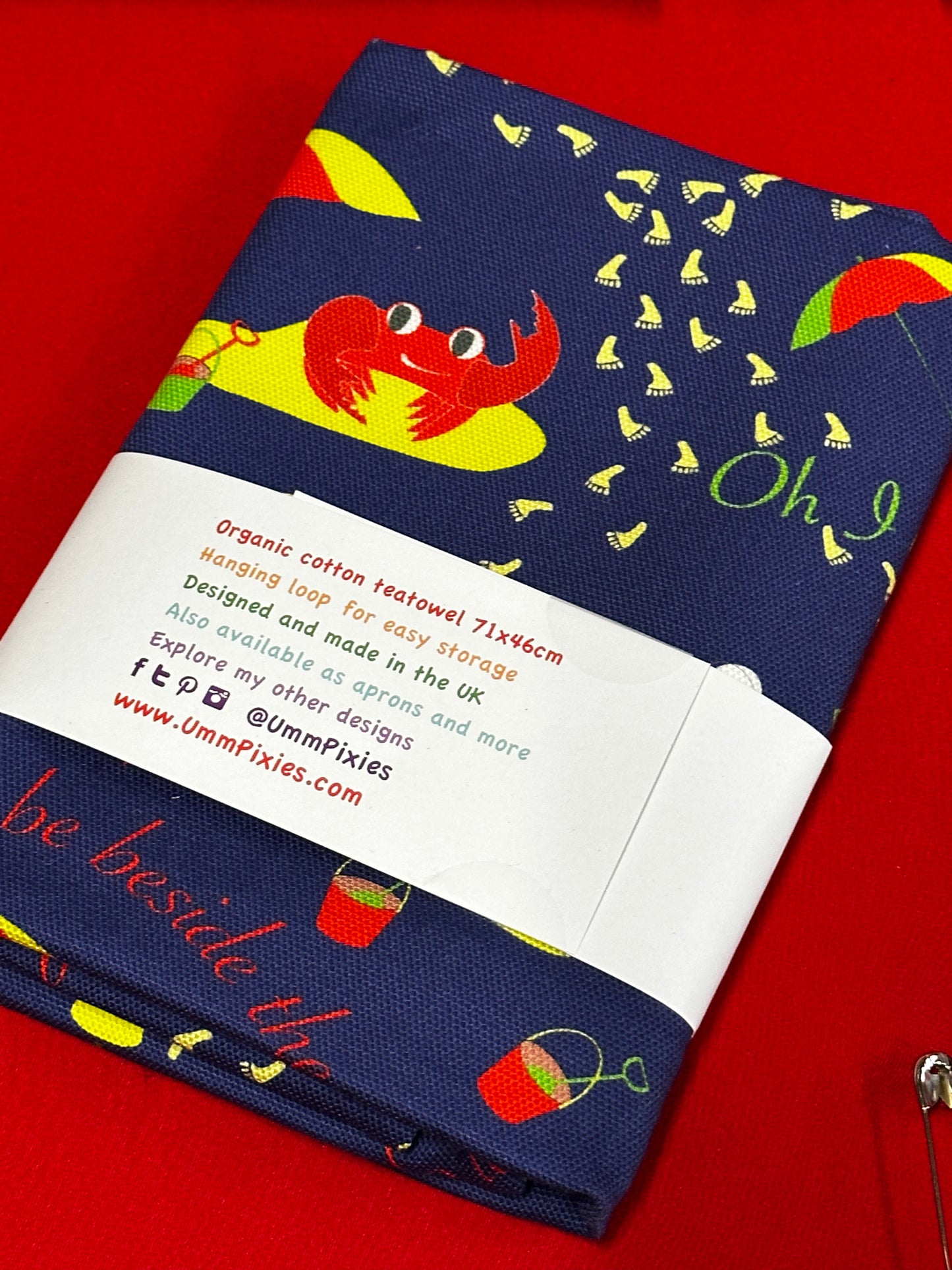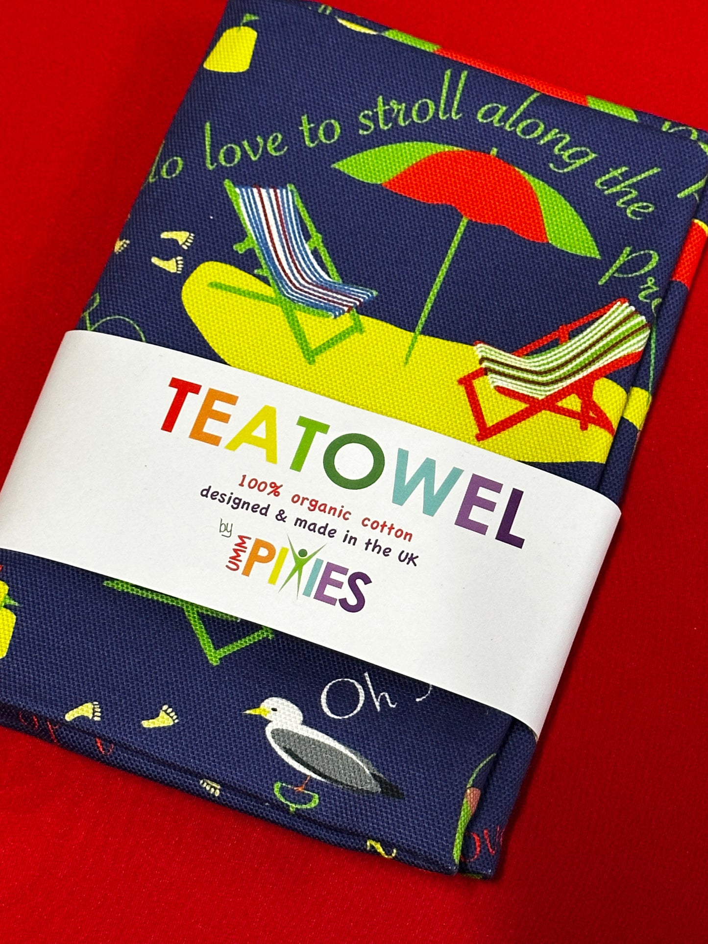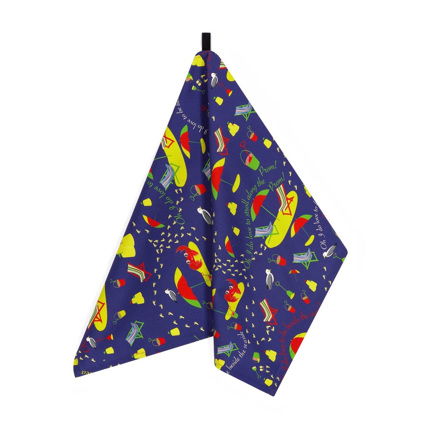 Luxury organic cotton tea towel featuring my colourful illustrations of the classic British seaside on a rich, deep blue background