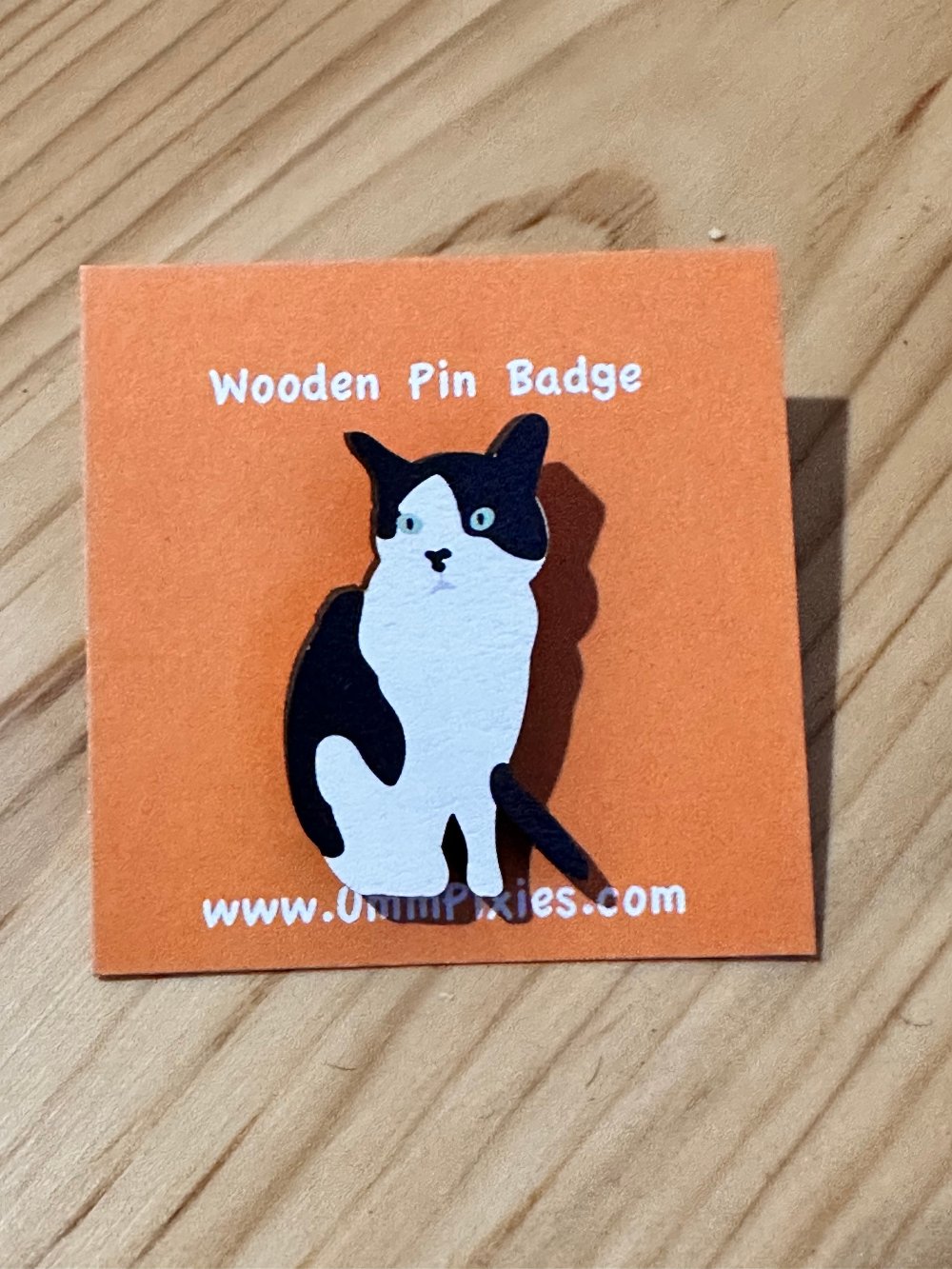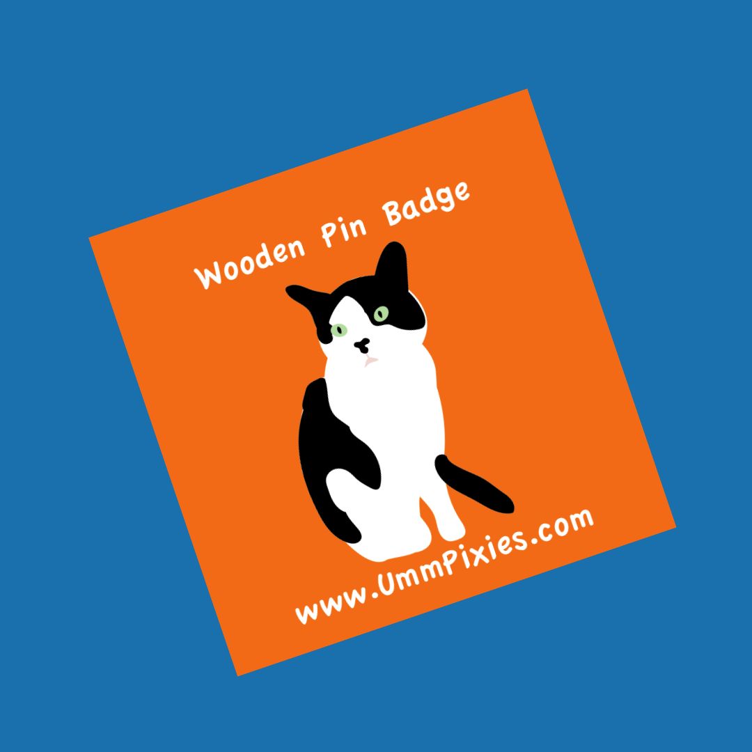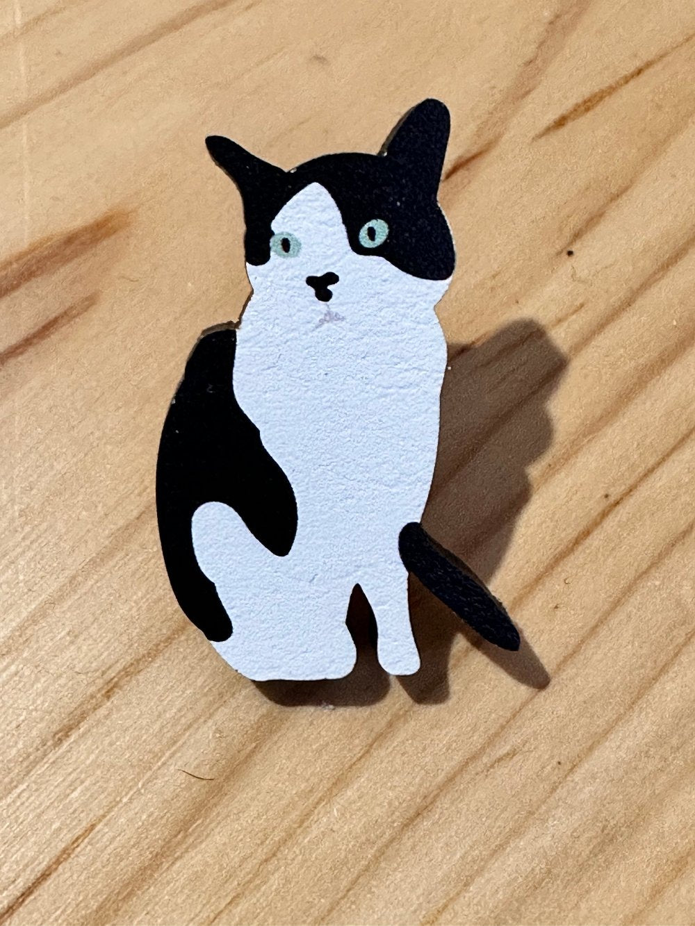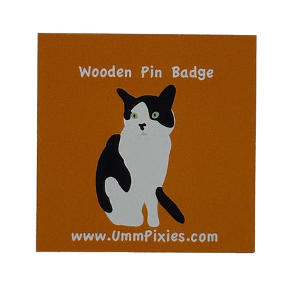 An eco-friendly wooden lapel pin badge featuring my very own tuxedo cat.