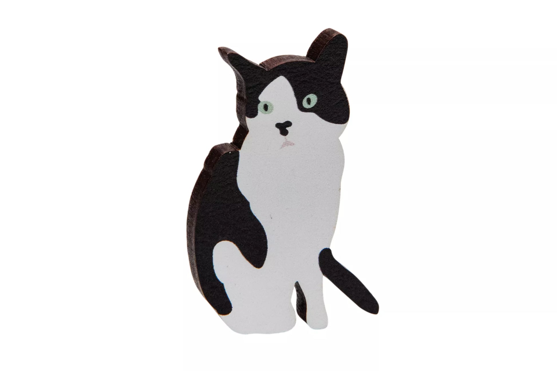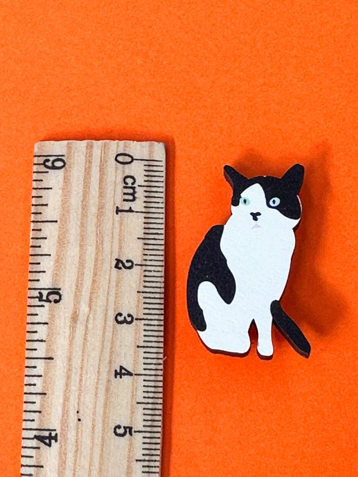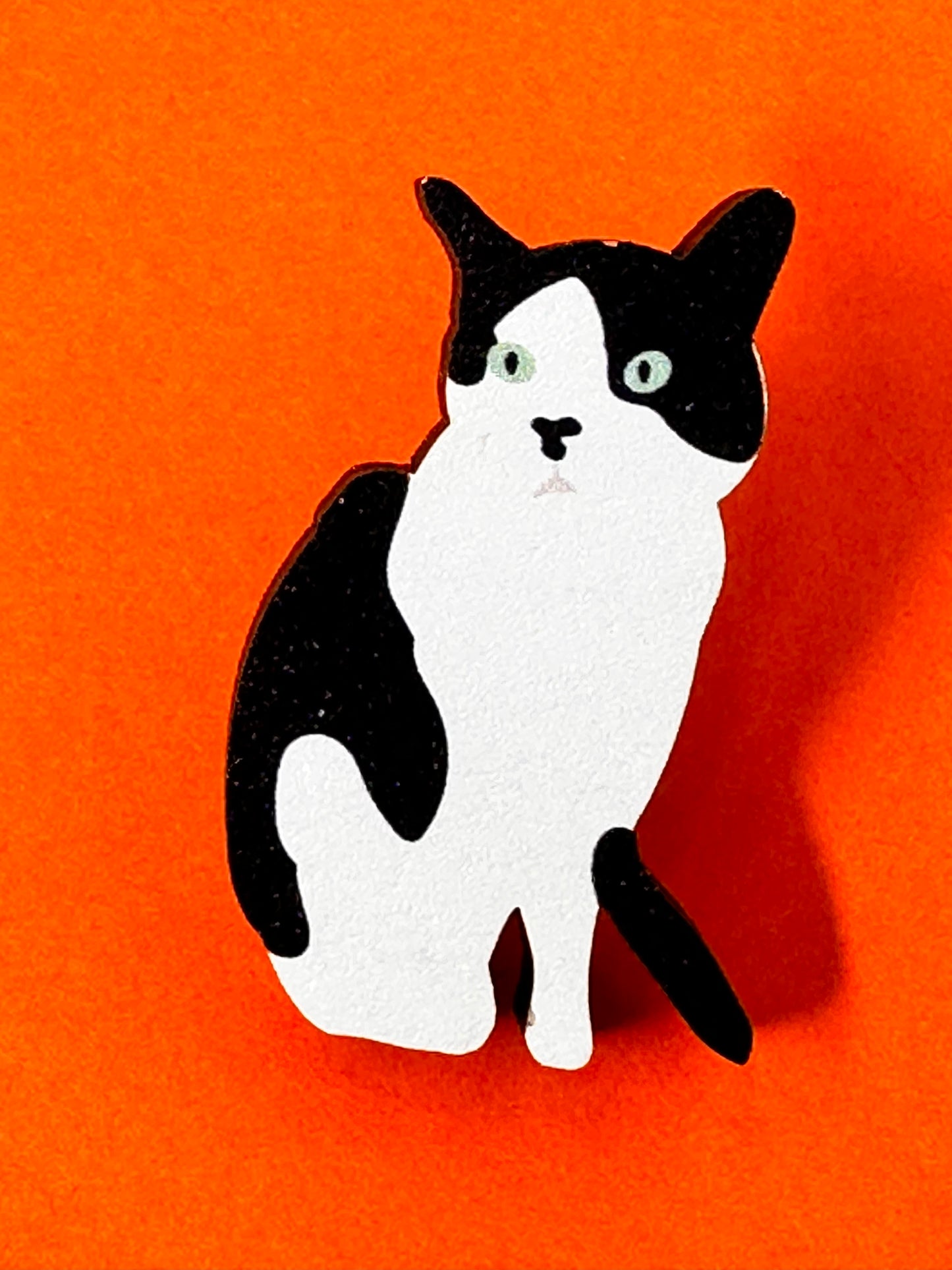 An eco-friendly wooden lapel pin badge featuring my very own tuxedo cat.