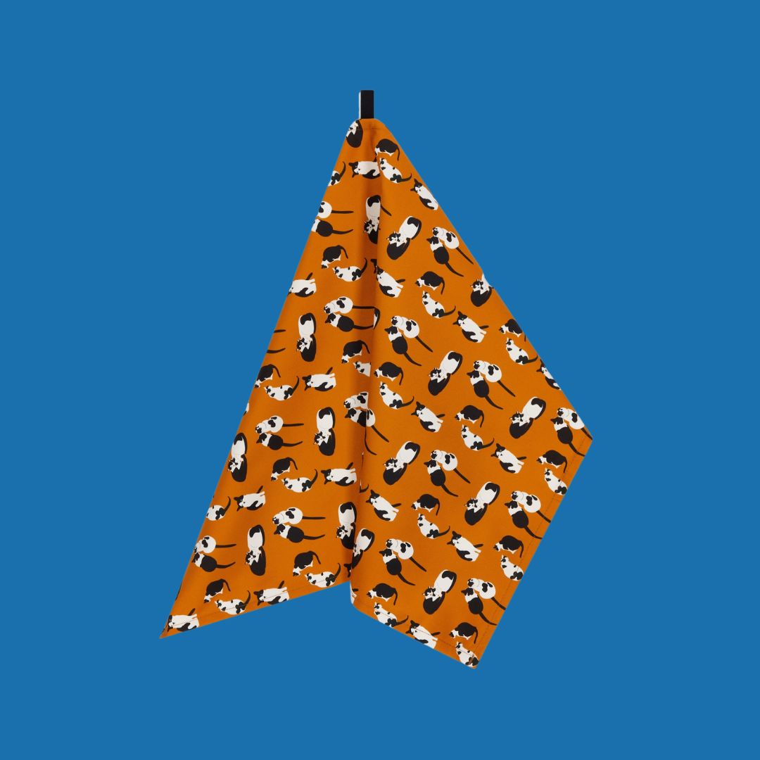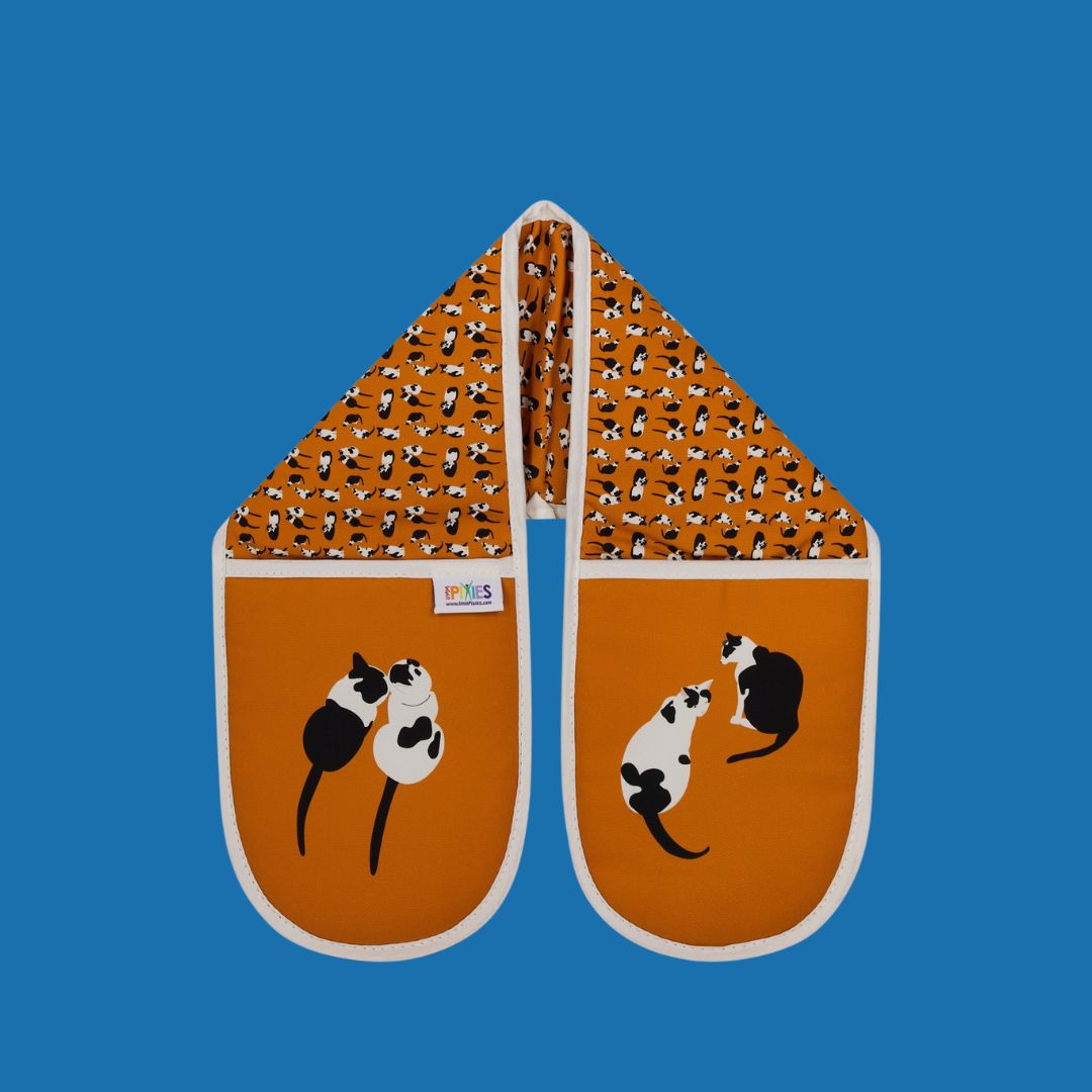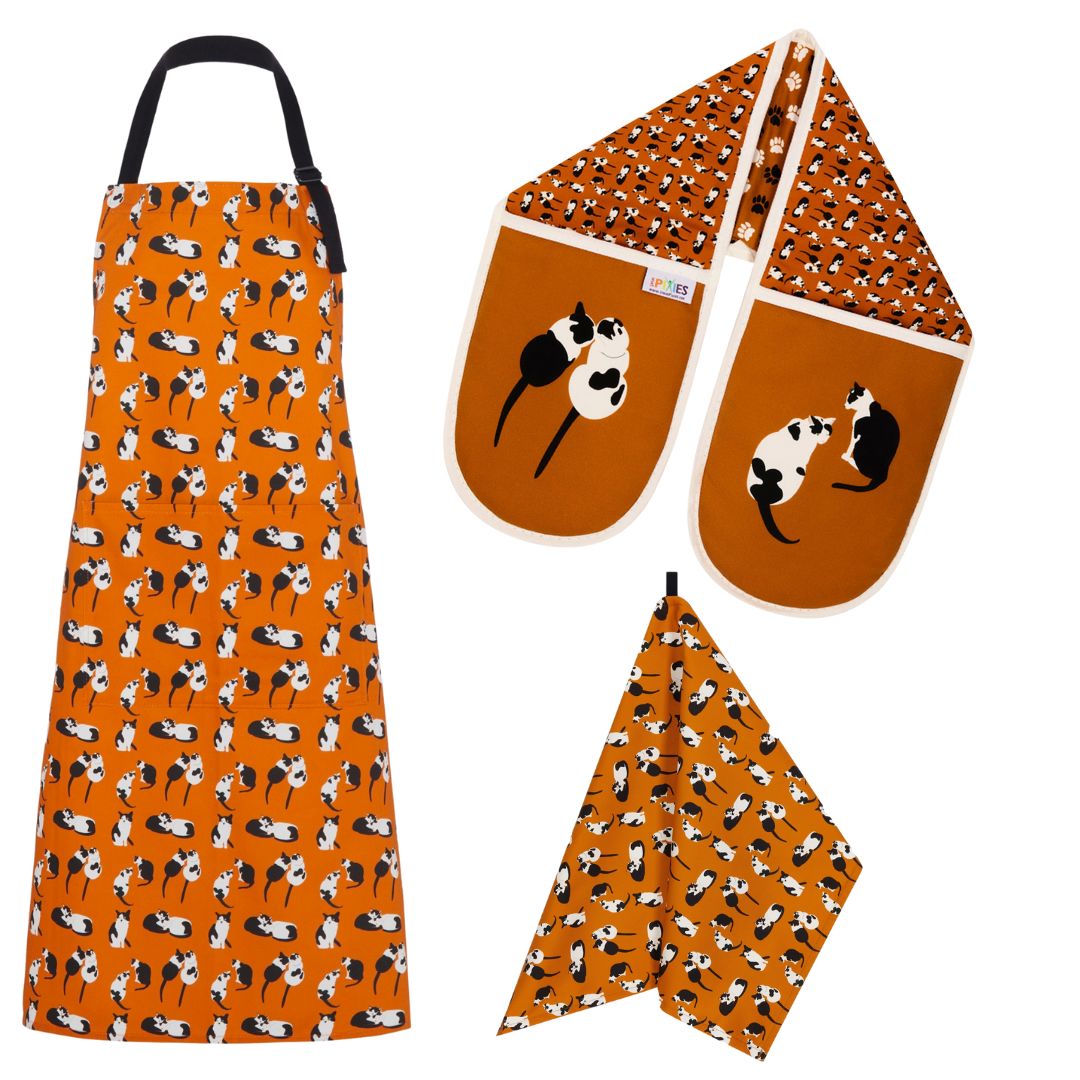 The perfect cat lover gift - the complete kitchen textile set includes the adult apron, oven gloves and matching tea towel.