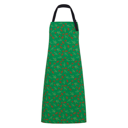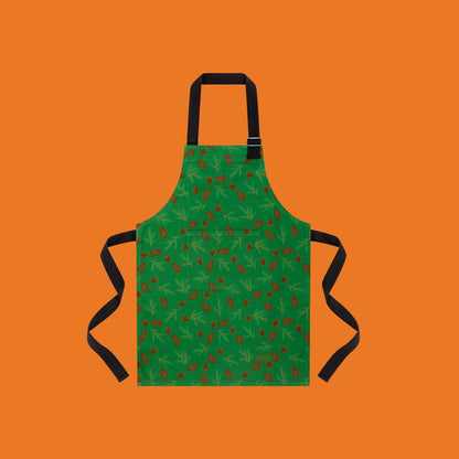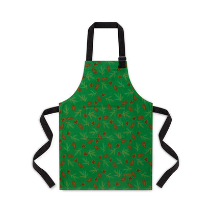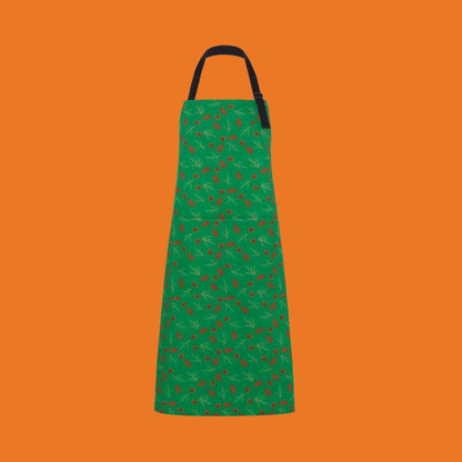 Luxury organic cotton unisex apron featuring my illustrations of Douglas fir cones and spruce cones and sprigs on a rich green background perfect for entertaining through the winter months