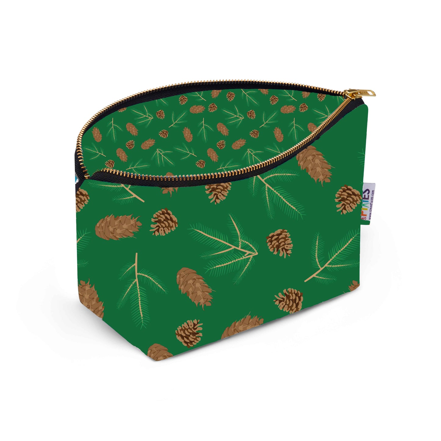 Luxury organic cotton zipped bag featuring my design of scattered fir and spruce cones and sprigs with a waterproof lining