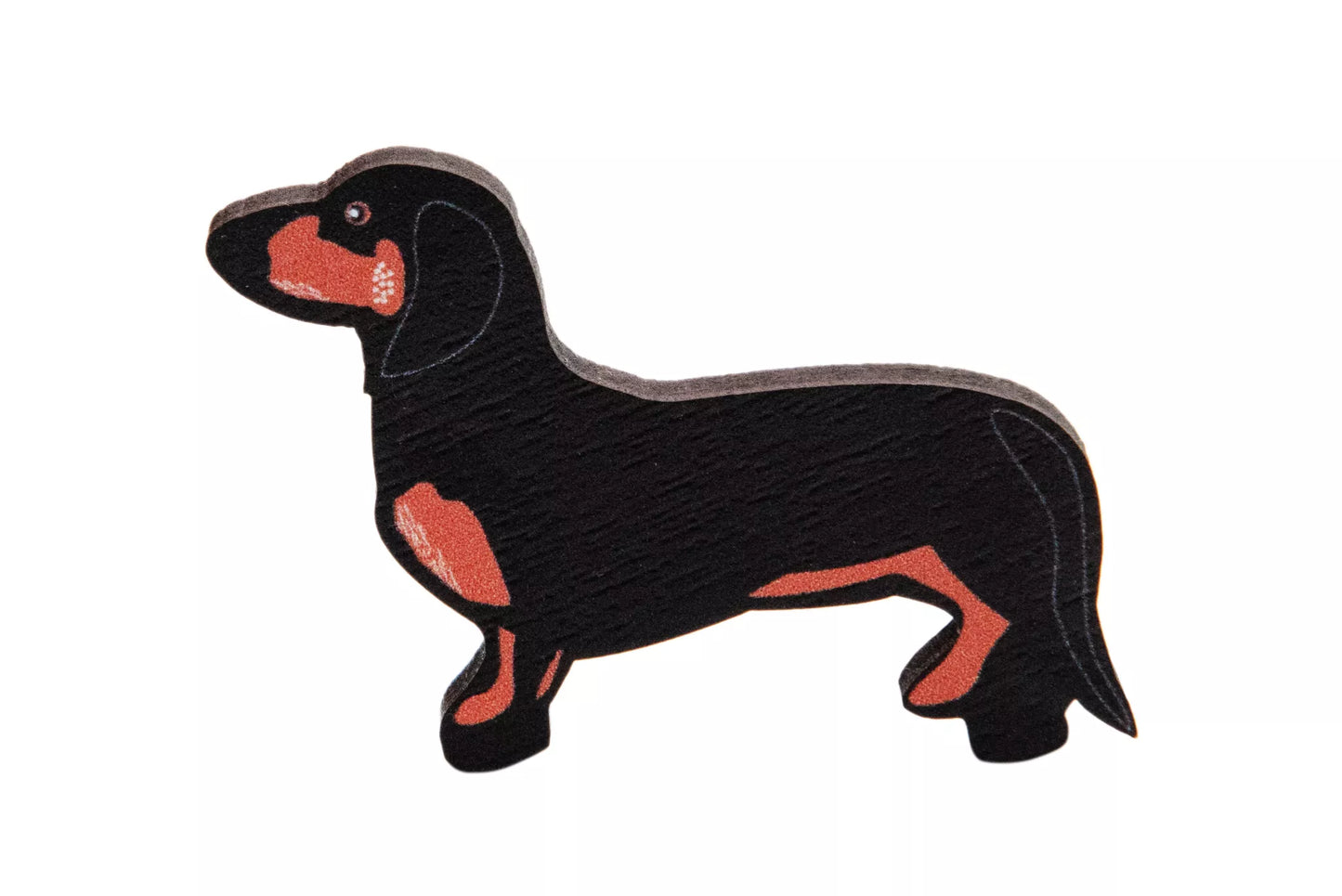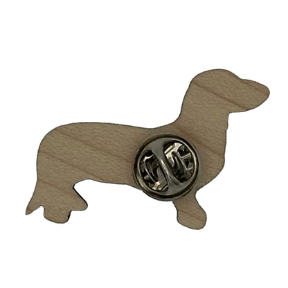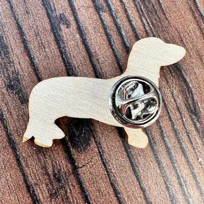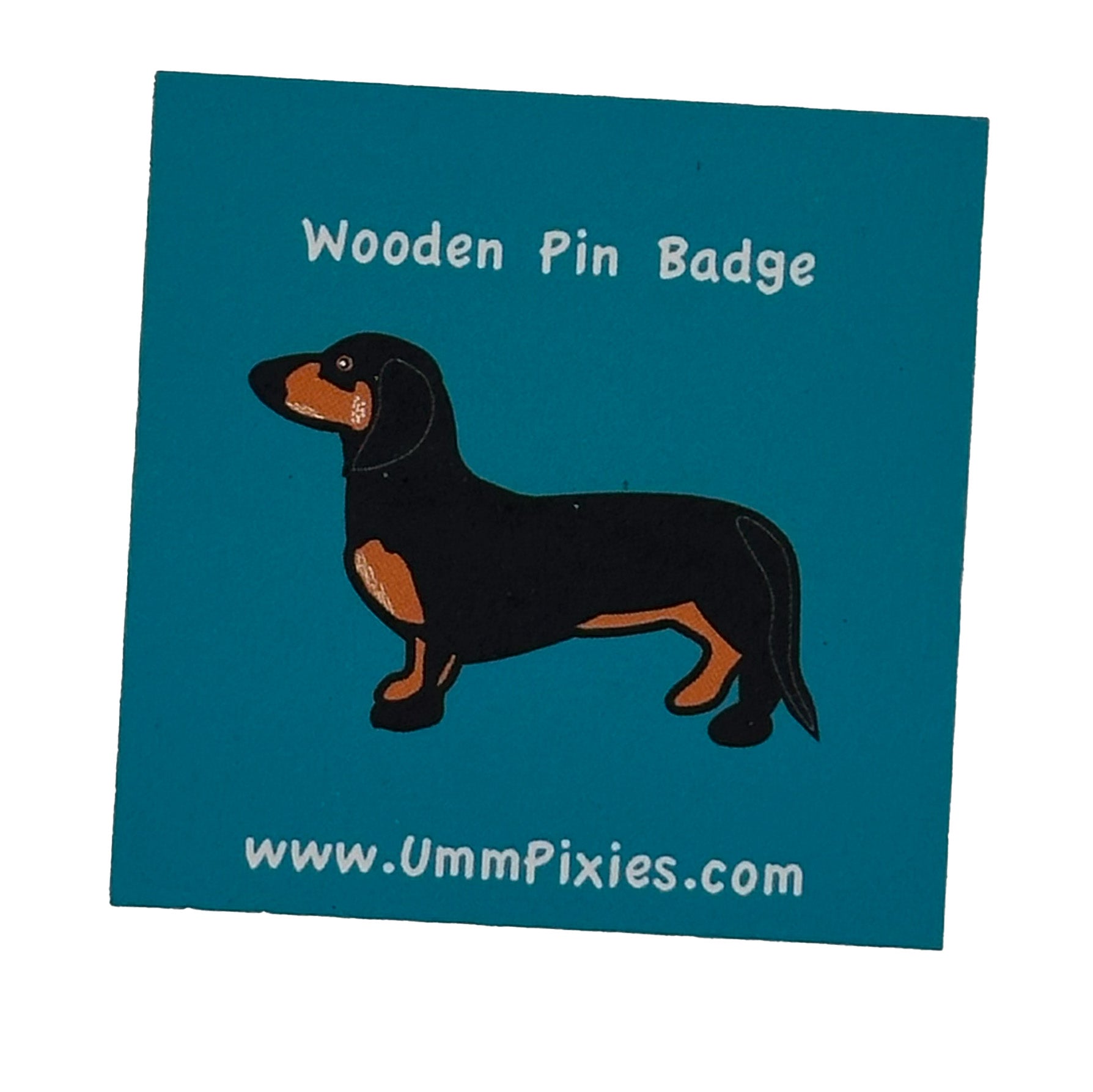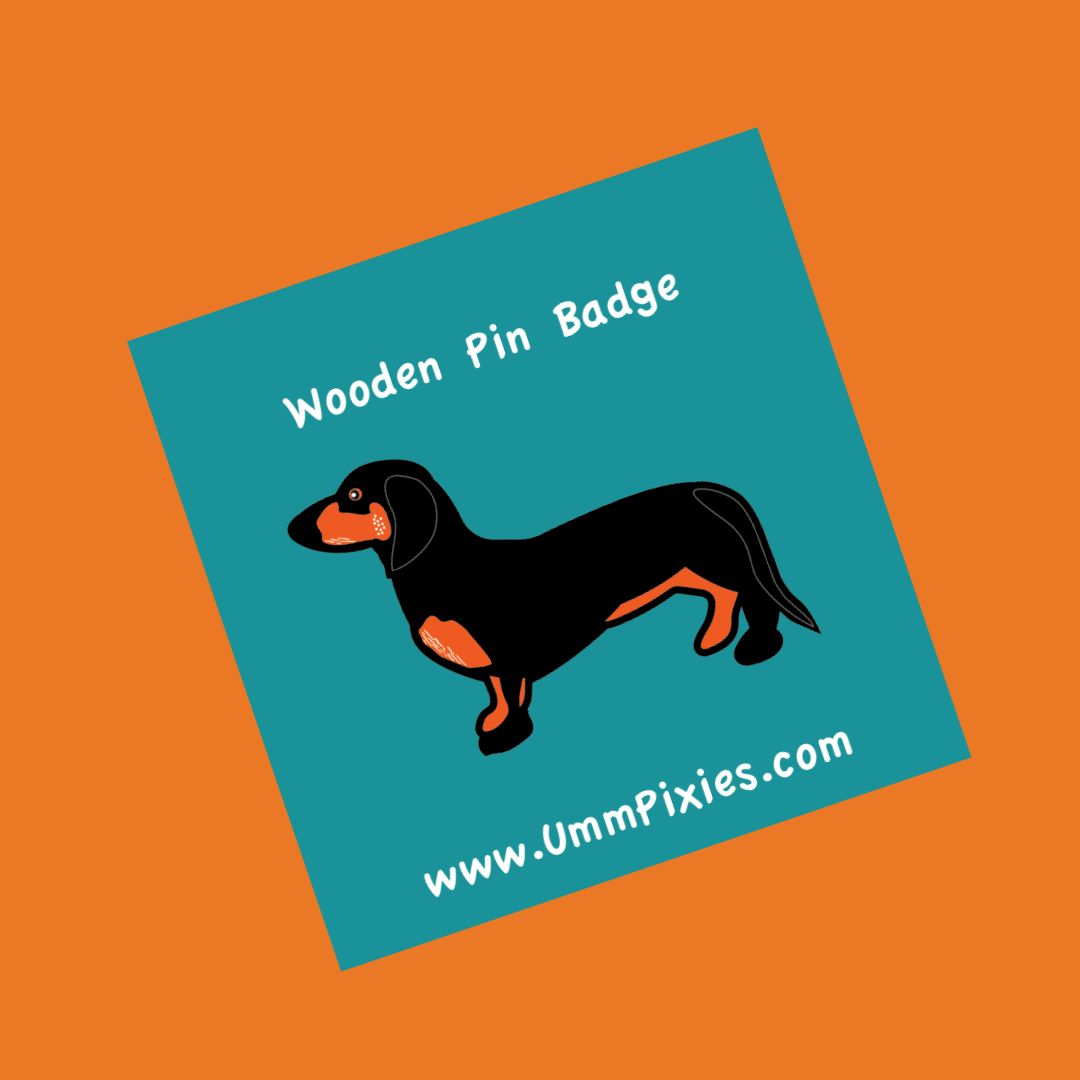 An eco-friendly wooden lapel pin badge featuring my popular dachshund design based on my own childhood companion