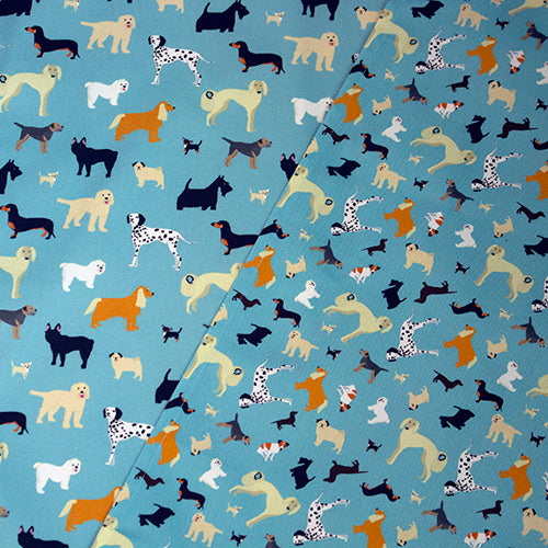 Luxury organic cotton tea towel featuring my illustrations of some of my favourite dogs on a bright blue kitchen towel
