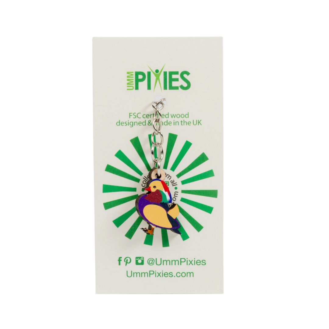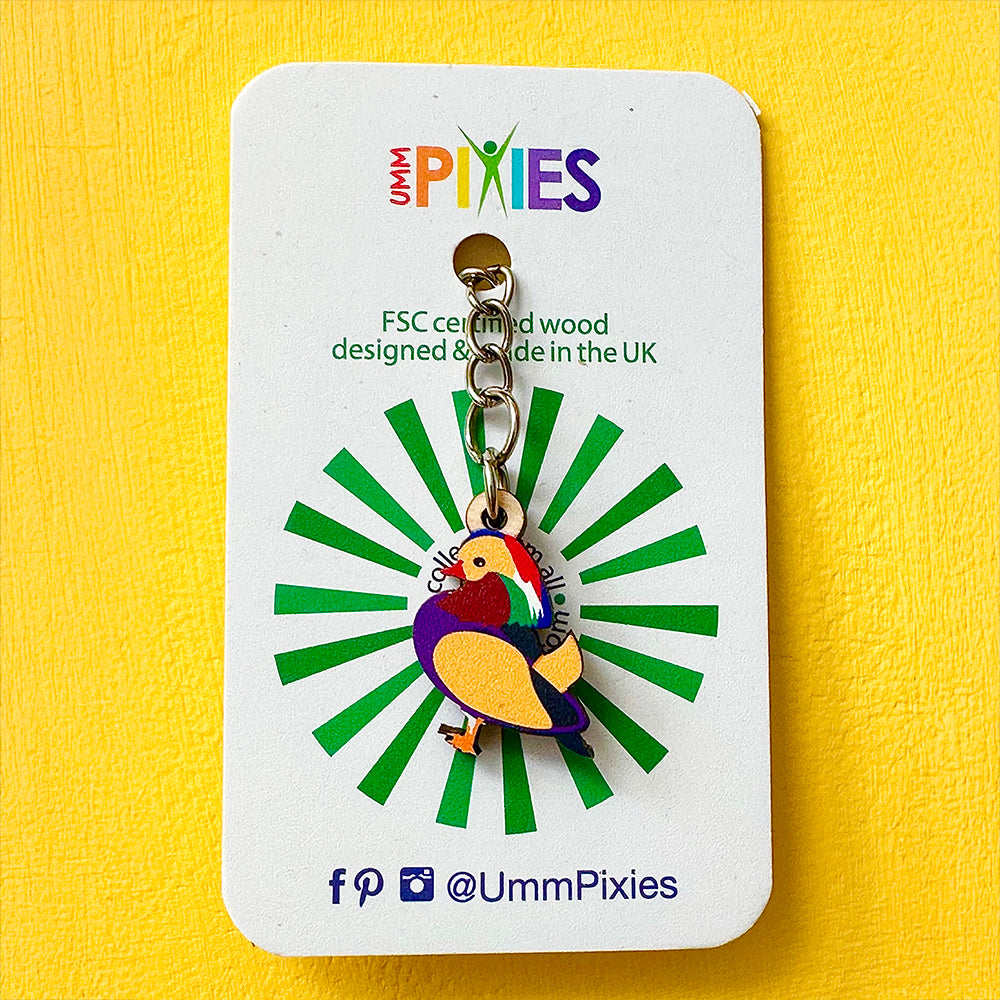 The mandarin ducks of the Kenwood ladies' pond are the inspiration for this fun eco-friendly wooden charm, attached by a link chain to a split ring keyring so you can easily attach your keys or add it to the zipper on your bag - makes a great conversation starter and you can collect my other designs to make a real feature of your collection