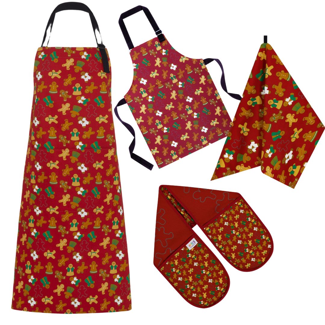 My eclectic gingerbread folk biscuit design gives a pop of colour and humour on this 100% organic cotton set of coordinating kitchen textiles. Matching adult and child aprons along with coordinating double oven gloves and tea towel. All designed and Made in Britain®