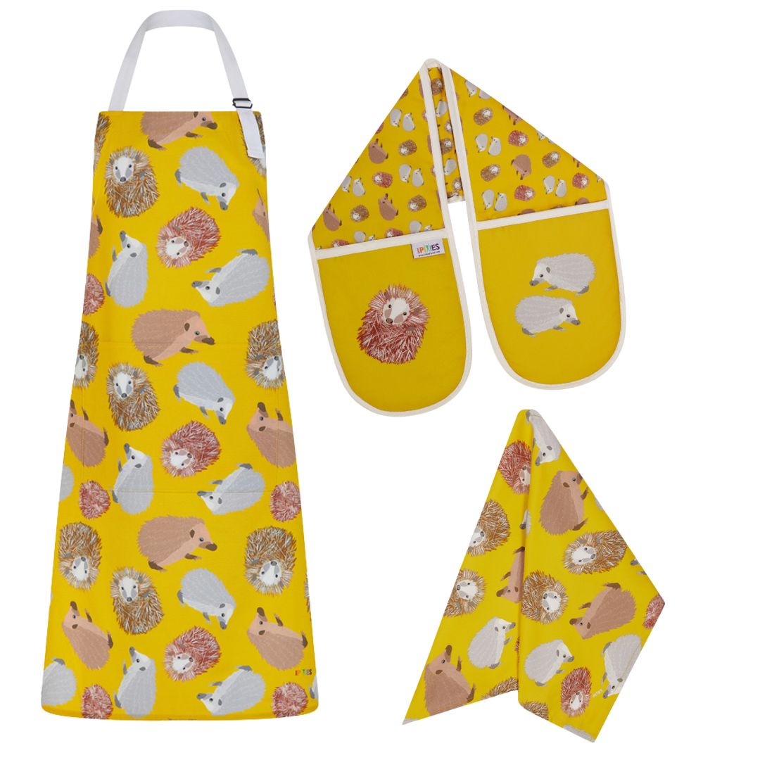 Sunny Yellow organic cotton set of kitchen textiles featuring my Hedgehogs illustrations.