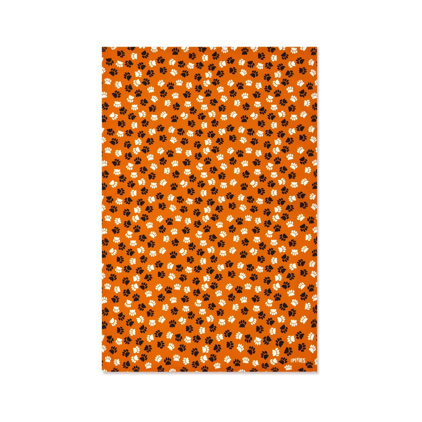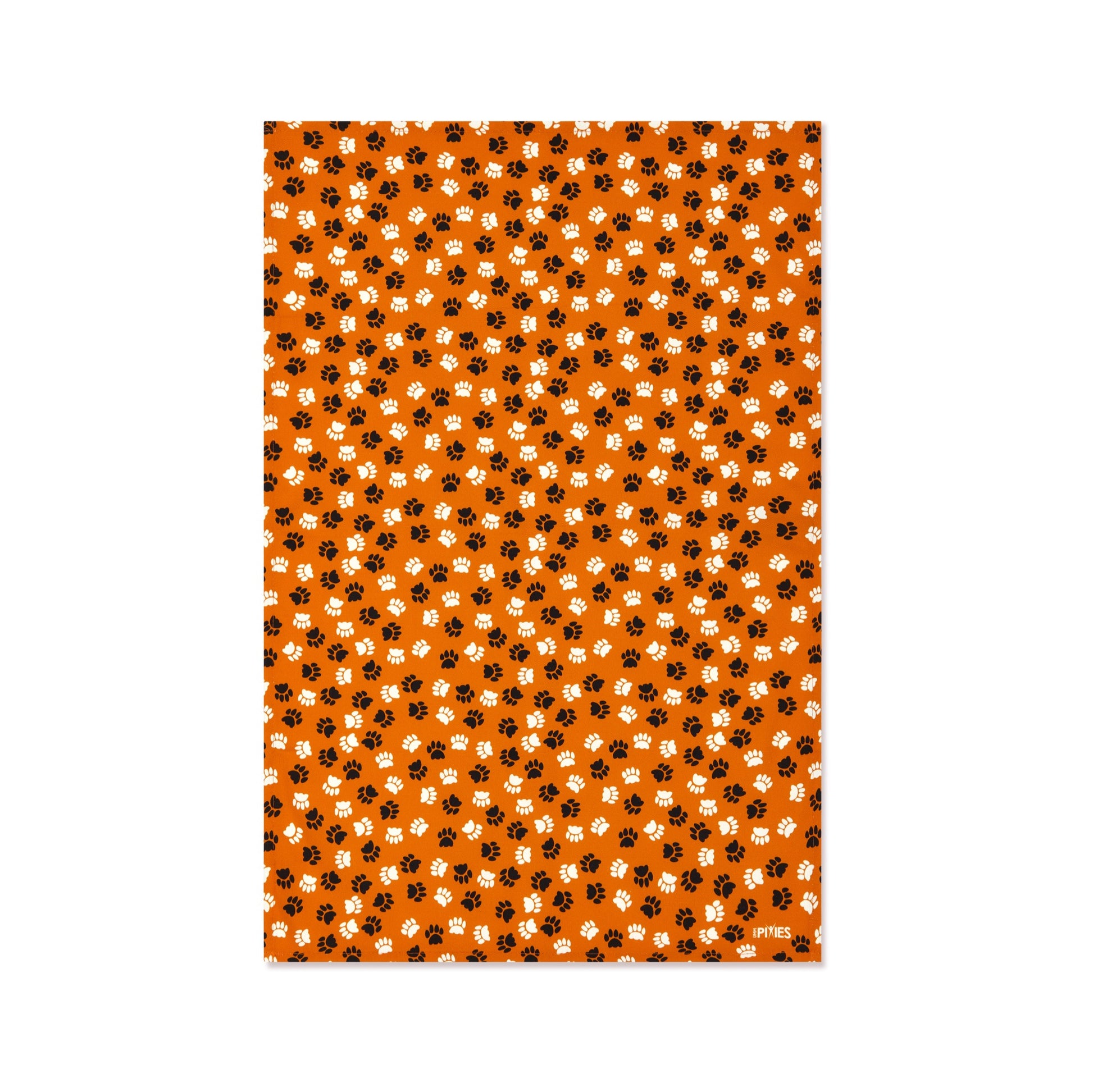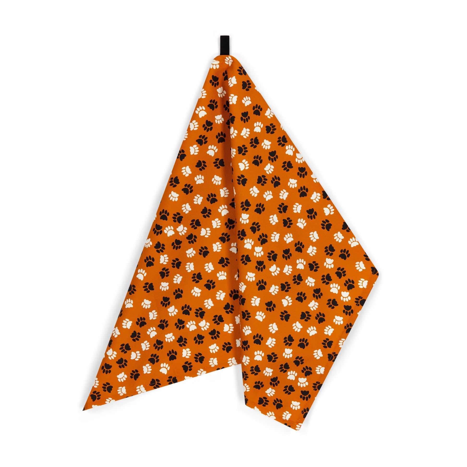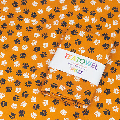 Luxury organic cotton tea towels featuring my illustrations of black and white paw prints on a vibrant orange kitchen towel