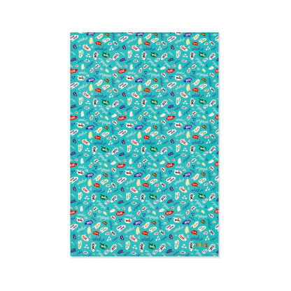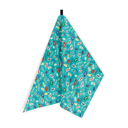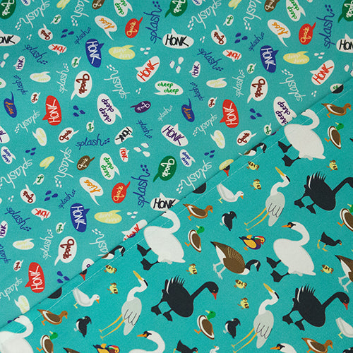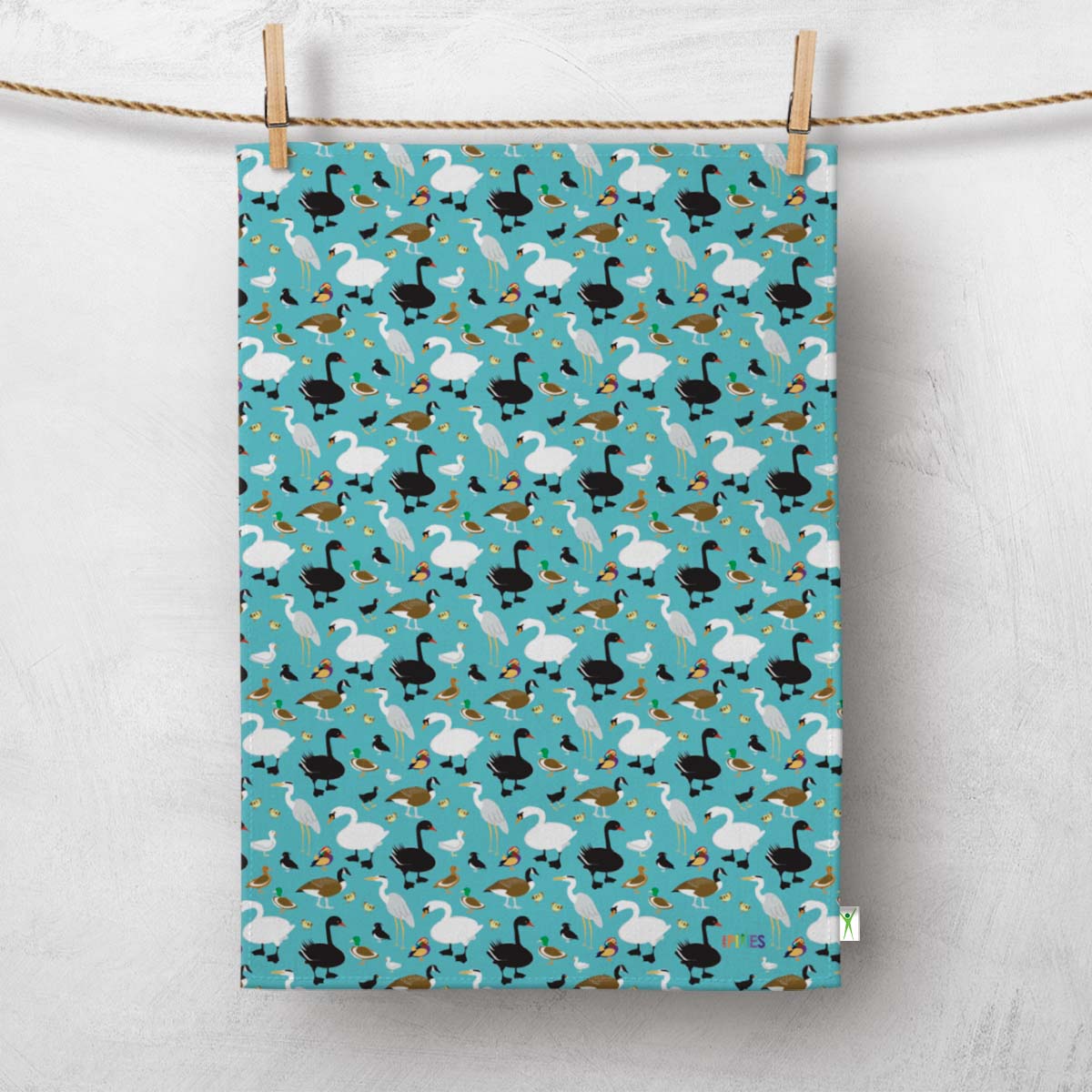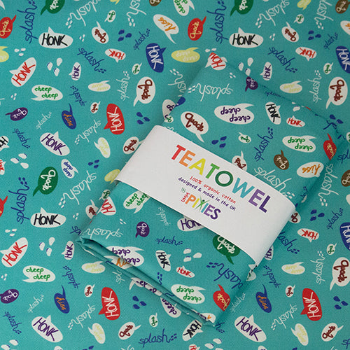 Luxury organic cotton tea towel featuring my illustrations of the sounds of my local duck ponds (spoiler alert: not just the ducks are noisy) on a bright teal kitchen towel