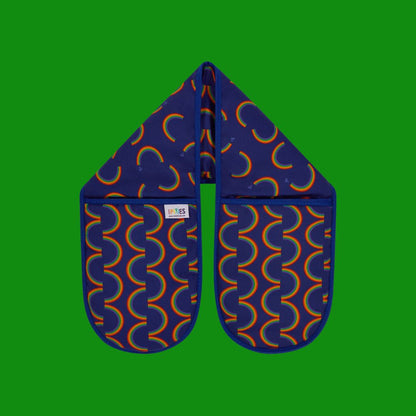 My exclusive design oven mitts featuring Rainbow Stripes and scattered rainbows on a rich, deep blue background.